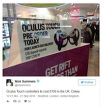 期待已久的也即将在下个月初公布发售信息的Oculus Touch控制器近期一直被欧洲零售商折腾,先后有德国电器零售店MediaMarkt和Saturn将Oculus Touch以199欧元的价格摆上销售。